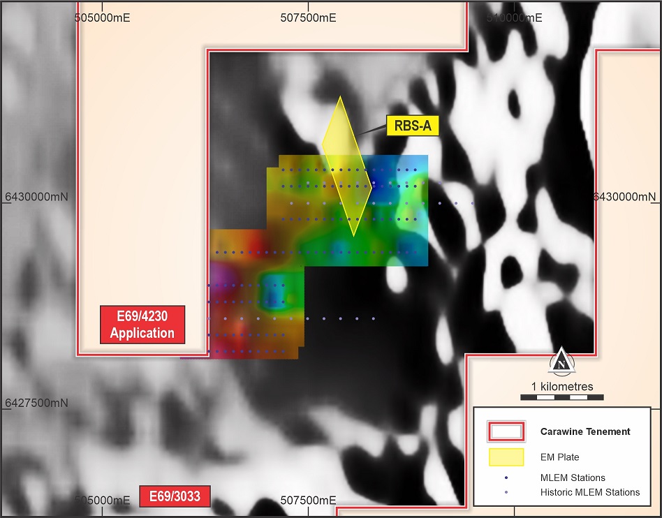 At Red Bull, one moderate strength MLEM anomaly has been identified in the northern part of the HW-1 target area on the southern Red Bull tenement. The source of the anomaly, named “RBS_A”, has been modelled as a large (~800m x 1,200m in area), moderate strength bedrock conductor with weak to moderate conductivity of 125 to 225 Siemens. The modelled source has a relatively shallow depth to top of approximately 100m, with a moderate to steep westerly dip, and moderate NW-NNW plunge. Further work is required to assess the potential source of RBS-A (refer ASX announcement 19 June 2024).