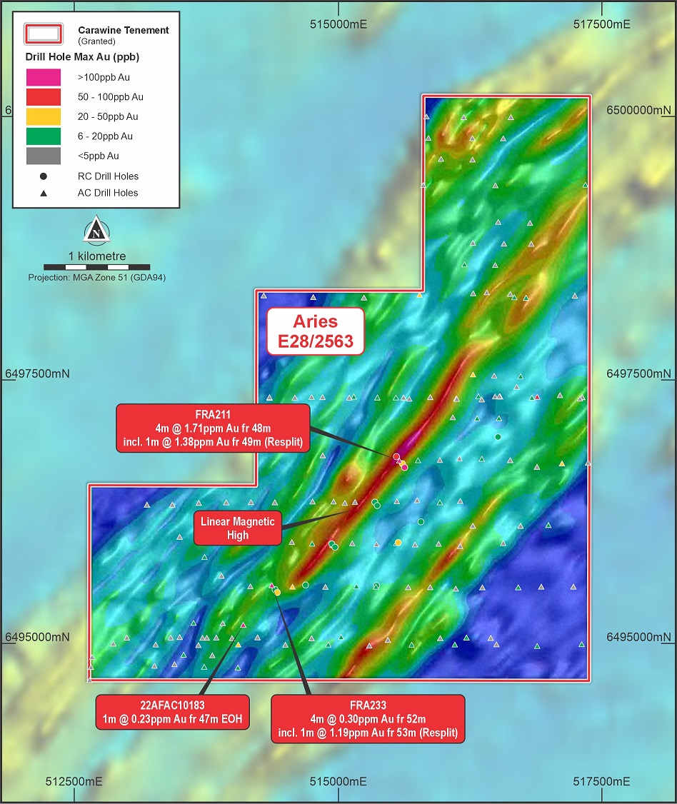 At Aries, a new gold target has been identified from previous exploration data, comprising a 3.5km-long northeast-trending linear magnetic high feature and associated anomalous drill hole gold intervals, including: