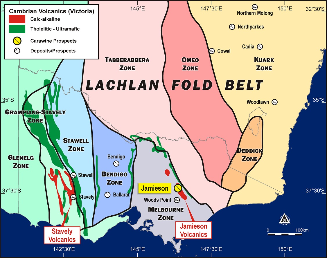 The association of the Jamieson Volcanics with the Mt Stavely Volcanics and the Mt Read Volcanics (a well-established, major metallogenic region of Australia), is considered to significantly add to the prospectivity of Carawine’s Jamieson Project to host significant mineral deposits.