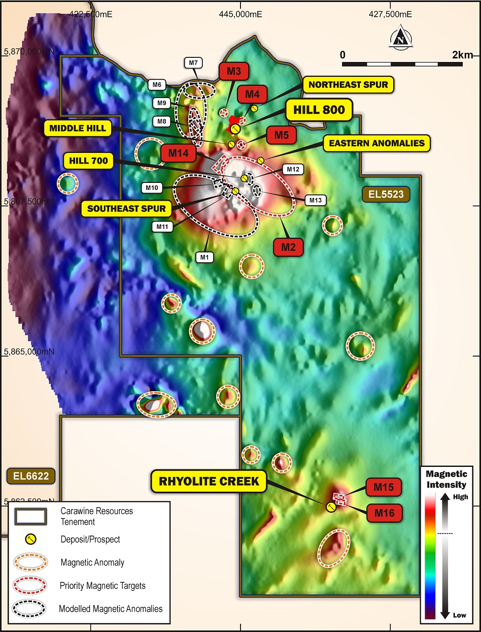 Analysis and 3D modelling of the heli-mag survey data identified fourteen anomalies around Hill 800 and the surrounding area, and two anomalies at Rhyolite Creek. From these, seven anomalies are prioritised for initial drill testing based on their size, depth, and location relative to known mineralisation and surface geochemical anomalism. These are anomalies M2 to M5 and M14 in the Hill 800 area, and M15 & M16 at Rhyolite Creek (refer ASX announcement 29 January 2020).