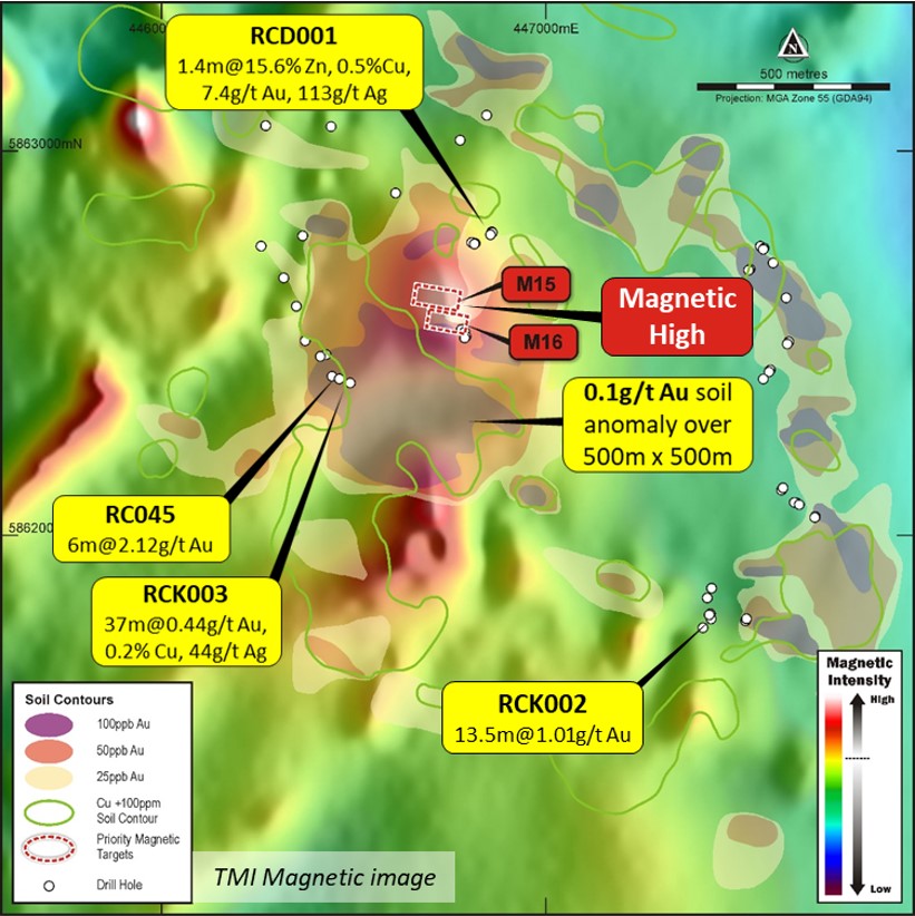 The Rhyolite Creek prospect is about five kilometres south of Hill 800 and comprises three distinct targets which require follow-up drilling: two potential large-tonnage, low-grade gold-copper targets and one seafloor-position VHMS gold and base-metal target. At surface, the prospect is defined by an extensive gold and copper soil anomaly in rhyolitic rocks and as with Hill 800, sits directly above a significant regionally anomalous magnetic high. This suggests, as with Hill 800, a potential magmatic input or control on the shallower, near-surface mineralisation.