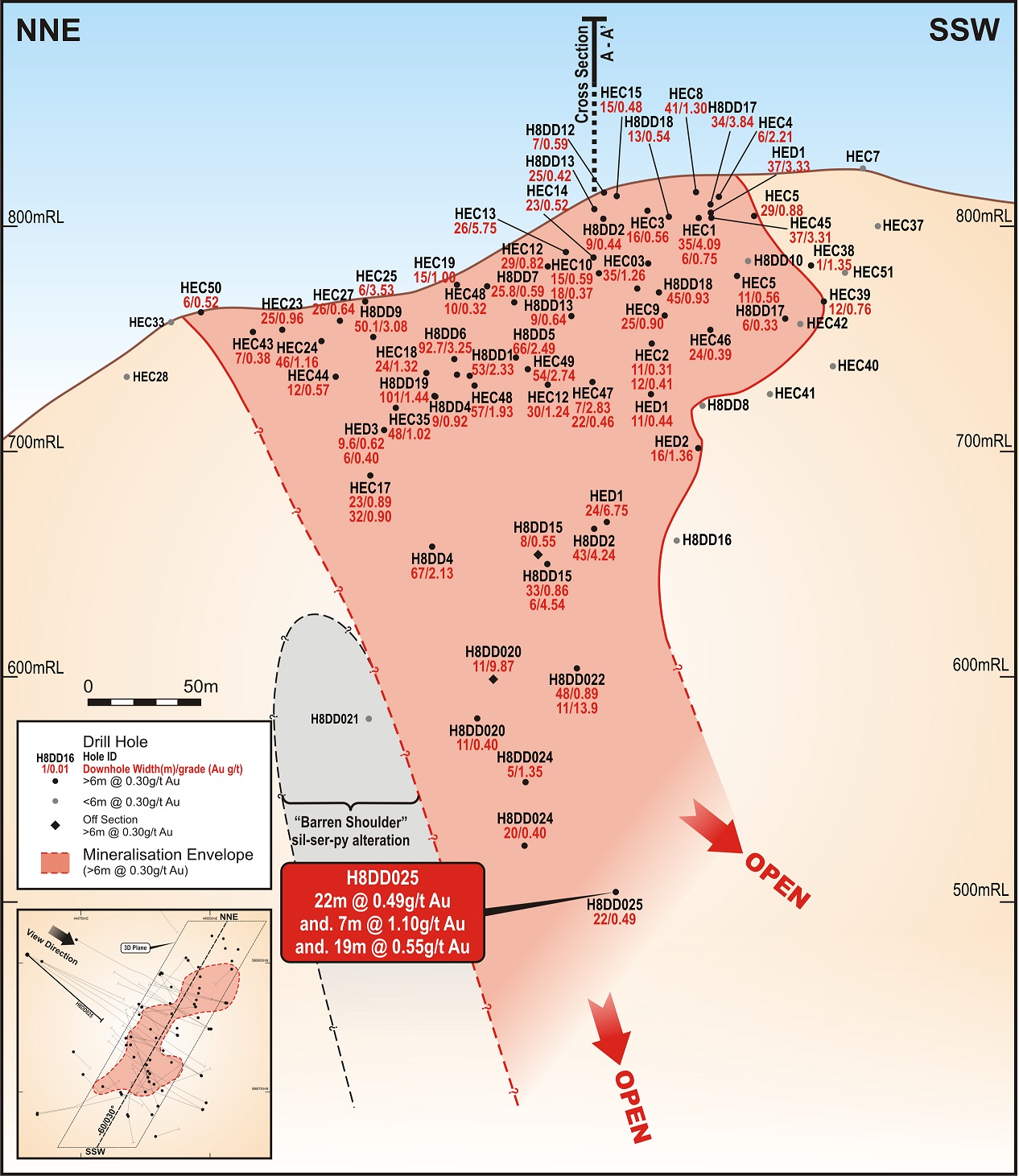Hill 800 long projection in the plane of mineralisation, looking southeast.