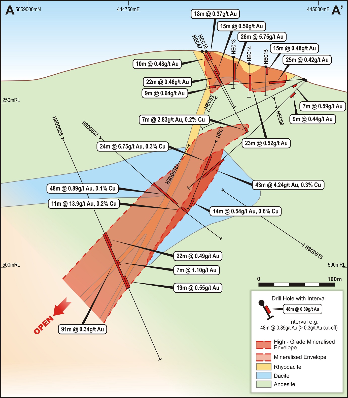 The mineralisation in these drill holes is reported as being associated with brecciated rhyolite and fragmented epiclastic rocks, and provides an excellent target for follow-up drilling to understand the style of mineralisation and explore for extensions and/or higher grades.