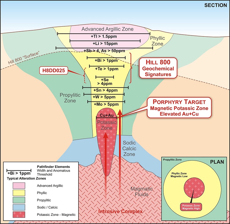 The Company's deepest drill hole at Hill 800 H8DD025 returned elevated concentrations of the porphyry pathfinder elements selenium (Se) and tellurium (Te) with a corresponding drop in bismuth (Bi) concentration. This may indicate a transition from the upper parts of the porphyry alteration system to the mid-levels, vectoring towards a potential copper-gold porphyry source at depth.