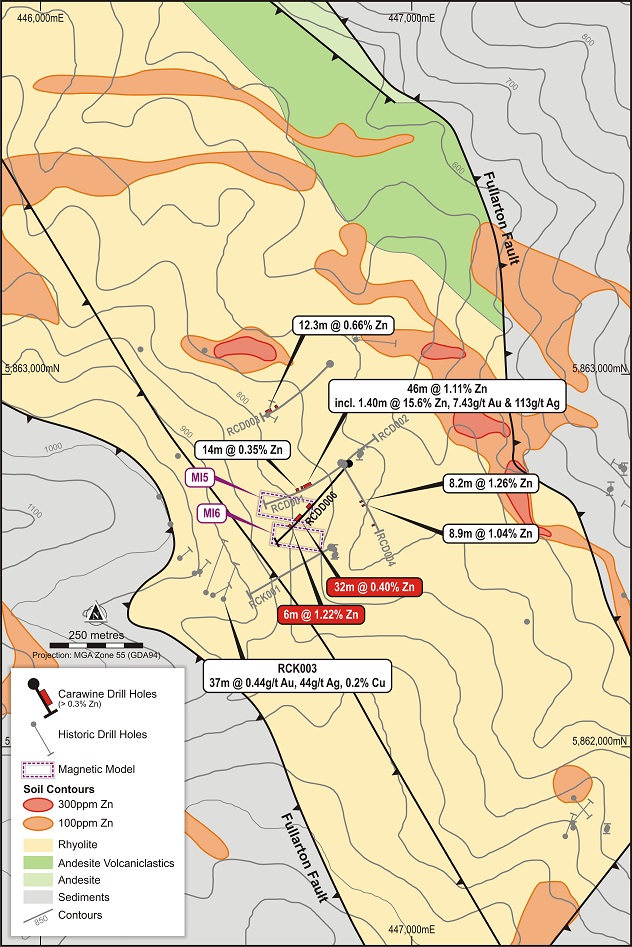 Drill hole RCDD006 was recently completed by Carawine as an initial test of this horizon approximately 80m to the south of historic drill hole RCD001, and the two magnetic anomalies M15 and M16 as potential porphyry source targets. The drill hole returned 1m @ 1.45 Zn from 255m within the prospective zinc horizon, above a broad zone of anomalous zinc with an interval of 32m @ 0.40% Zn from 309m, in strongly altered andesitic volcaniclastics. Between 270m and 305m downhole a magnetic, porphyritic intermediate intrusion appears to have stoped out the mineralised andesite volcaniclastic unit and much of the prospective horizon, as also occurred in historic drill hole RCD002. There is an additional highly magnetic porphyritic intermediate intrusive further up-hole, and together these are interpreted to be the likely sources of the M15 and M16 magnetic anomalies.