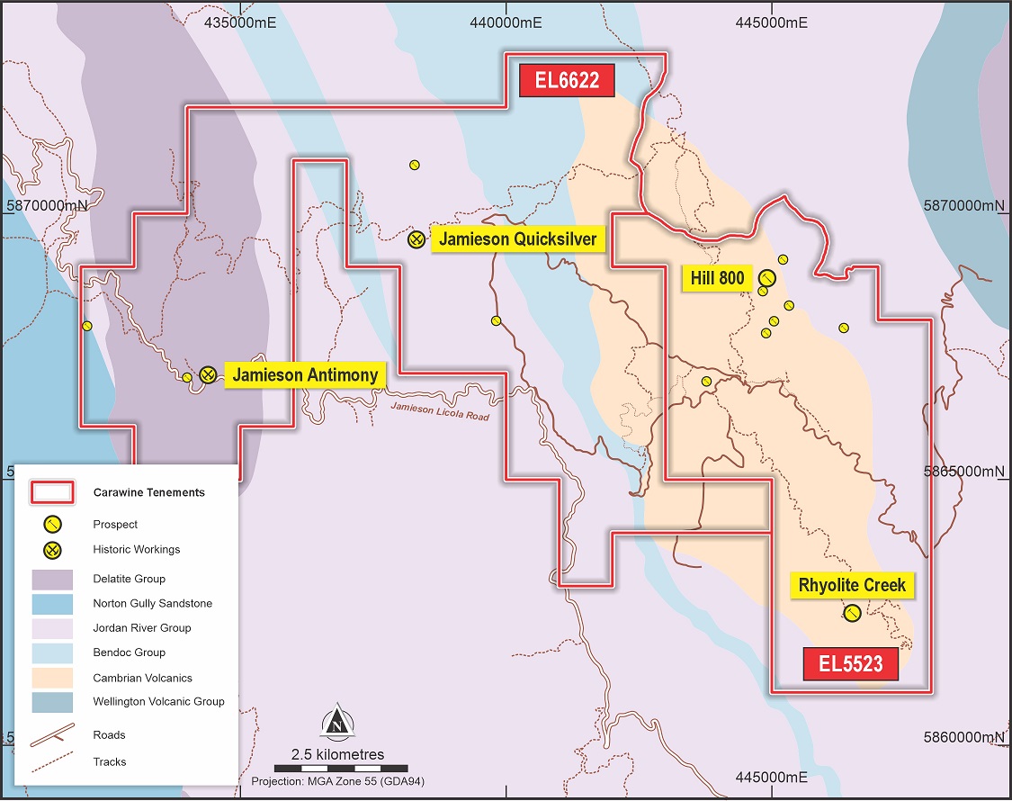 The Jamieson Project is located on unrestricted crown land within the Mt Useful Slate Belt geological province. The region was founded on gold in the 1850s, with several historic and currently operating gold mines. The project comprises granted exploration licences EL5523 and EL6622, covering Ordovician and Silurian aged sediments and Cambrian age volcanic rocks in the Mt Useful Slate Belt geological province. The focus of Carawine’s work is the “window” of Cambrian volcanic rocks known as the “Jamieson Volcanics”.