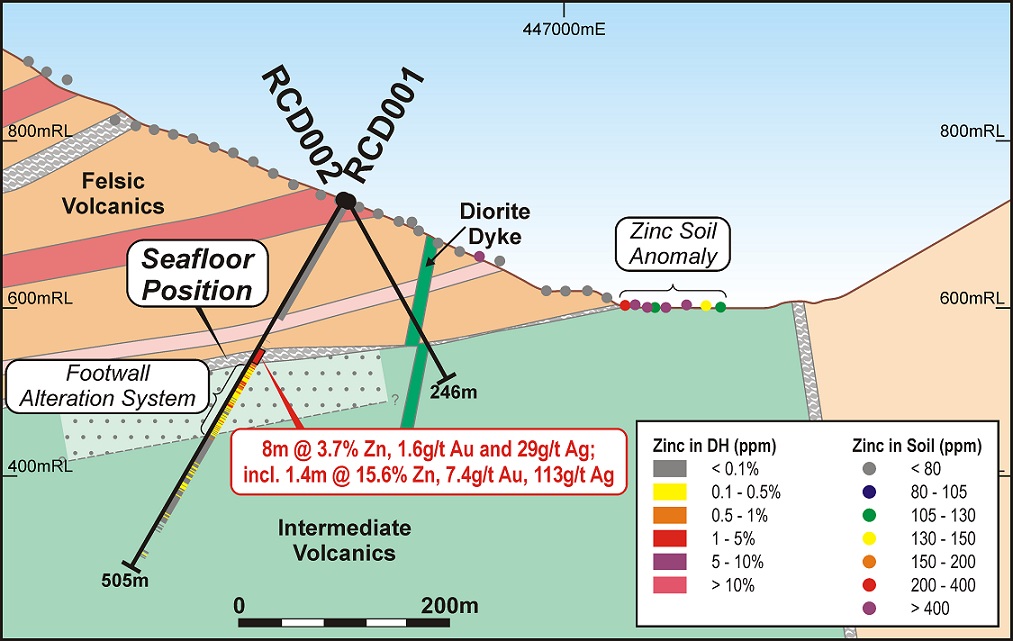 Stratigraphically below the main anomaly, historic drill hole RCD001 intersected a high grade zinc-gold-silver horizon at the contact between andesite (below) and rhyolite (above), representing a classic seafloor volcanogenic massive sulphide (VMS) mineralised position:
